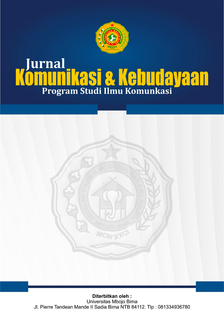Vol. 12 No. 1 (2025)Jurnal Komunikasi dan Kebudayaan memuat riset tentang bidang ilmu komunikasi dan temuan-temuan terkini yang diadaptasi dalam perkembangan ilmu komunikasi dan budaya. Cakupan bidang yang dimuat meliputi; Komunikasi Organisasi, Komunikasi Massa, Komunikasi Pembangunan, Jurnalistik, Hubungan Masyarakat, Periklanan, Manajemen Komunikasi dan Media, Kajian Budaya, Komunikasi Pariwisata, Psikologi Komunikasi dan Komunikasi Politik. Jurnal diterbitkan oleh Universitas Mbojo Bima dan penerbitan artikel dilakukan dua kali dalam setahun, yakni pada bulan Mei dan November.
